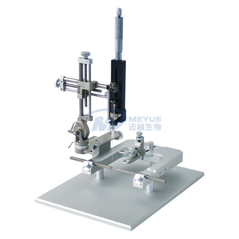 在腦立體定位儀操作中,經(jīng)常需要對動物進(jìn)行微量注射,可以采用手動型微量注射泵,使用方便,直接將注射器針筒安裝到夾持器,通過微推進(jìn)器控制注射器活塞的精確移動,直接對實驗動物注射或回收液體,避免了采取導(dǎo)管方式產(chǎn)生的誤差。該注射泵兼容大部分進(jìn)口和國產(chǎn)微量注射器(1ul-100ul),推進(jìn)的位移精度為10μm(也就是每旋轉(zhuǎn)1個小格,注射器活塞前進(jìn)10um),可推進(jìn)距離50mm。